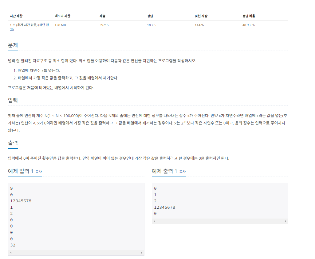 - 힙이 비어있다면 문제의 조건에 맞춰 0을 출력한다