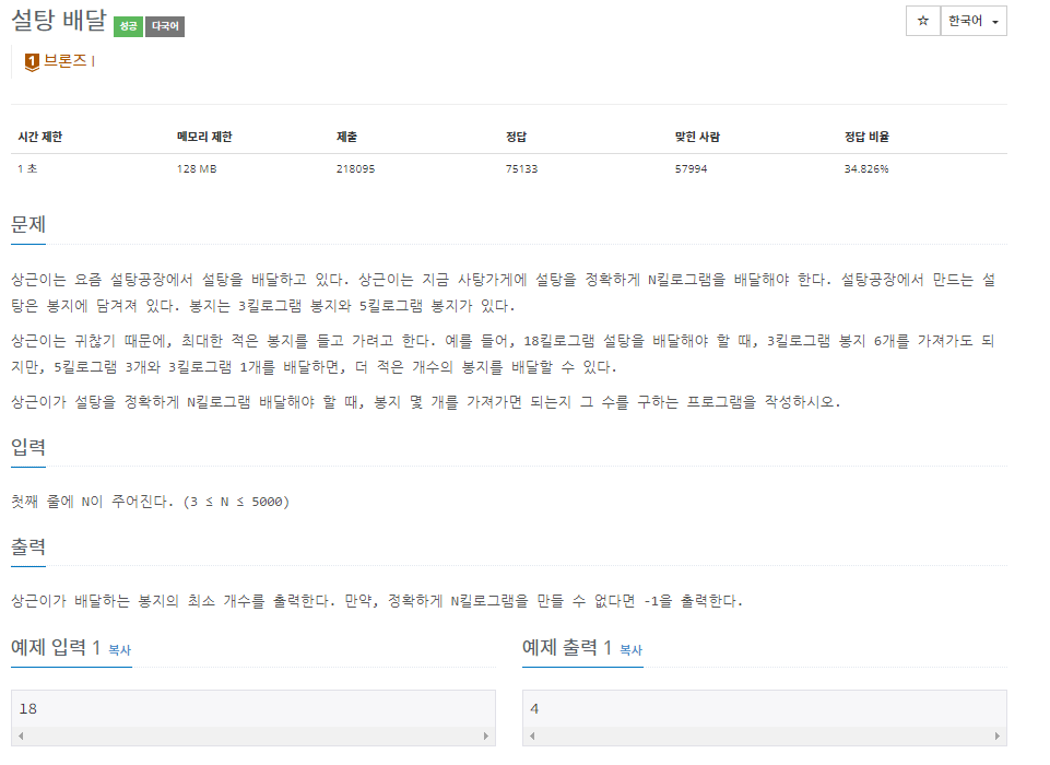 이 문제에서 생각할 수 있는것은 '가장 큰 단위의 설탕부터 생각하자' 다. 만약 18킬로그램의 설탕을 나눠 담아야 한다고 하면 이것을 3킬로봉지 6개로 담을수도있고, 다양한 방법이 있을 수도 있지만, 조건에서는 '최소 개수'를 구하는 문제이므로 가장 큰 단위부터 나눠 담고 나머지를 그 다음 단위의 봉지로 나눠 담는 해결방법을 떠올릴 수 있다.