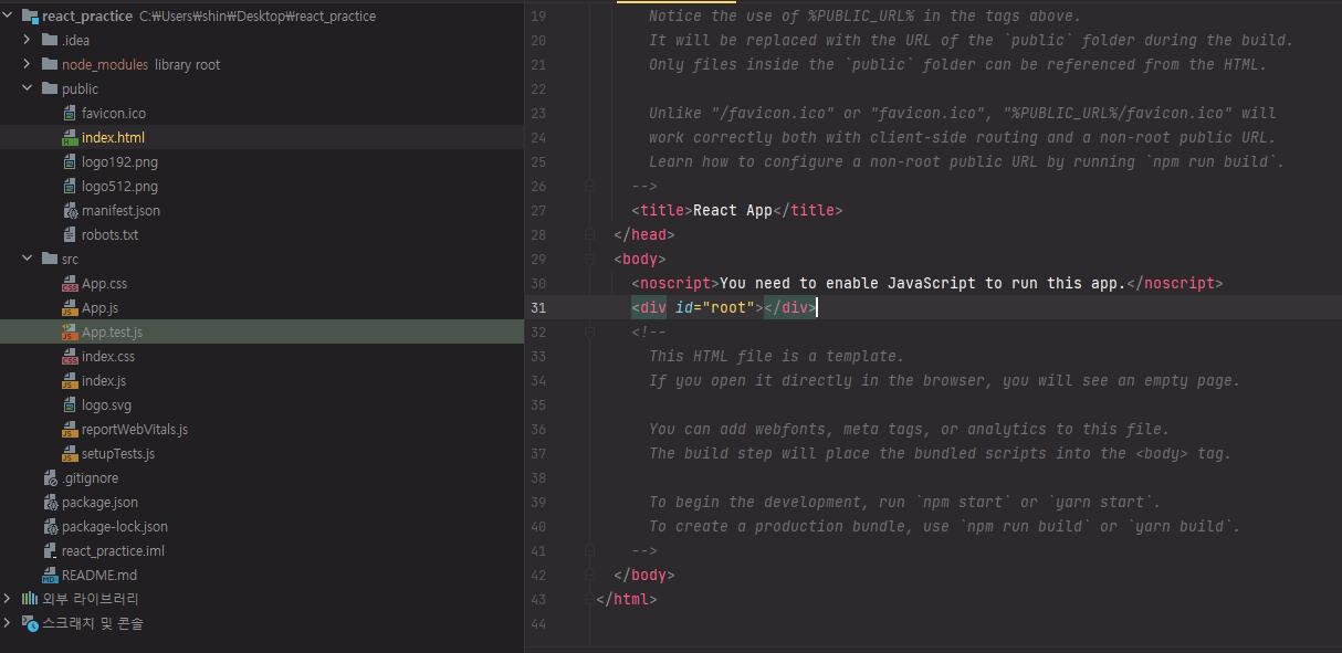 App.js는 메인페이지를 짜는 곳, public/index.html은 실질적인 html파일