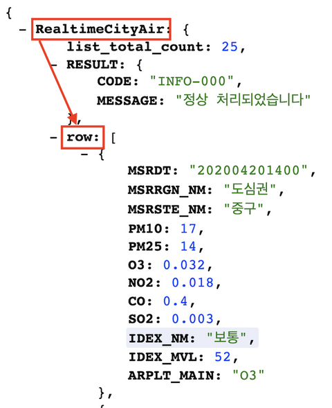 위 코드에선 구 이름값인 MSRSTE_NM과 미세먼지 값인 IDEX_MVL만 뽑아낼 수 있게 된다