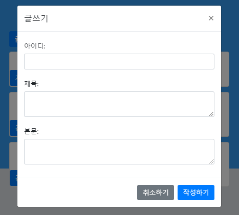글쓰기 버튼을 누르면 모달형식으로 아이디와 제목 본문을 입력하는 창이 나온다