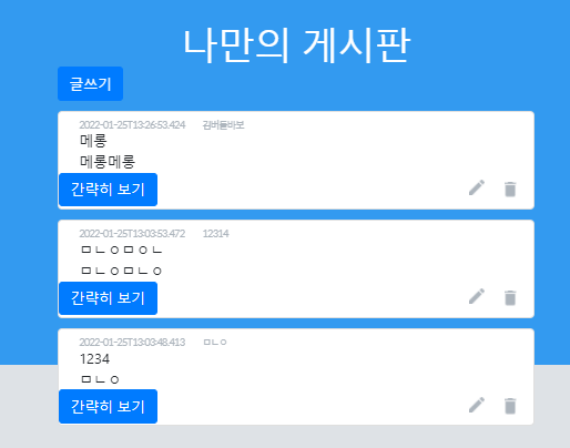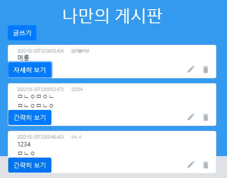 각 게시글마다 자세히보기를 누르면 내용이 나오고 간략히보기를 누르면 제목만 나온다